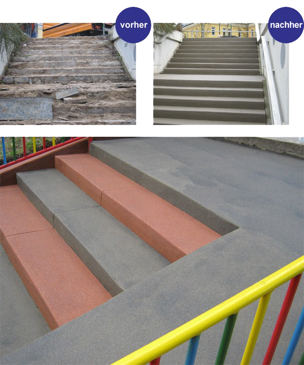Wir sanieren Treppenanlagen, Bordsteine, Brücken, Beton- und Pflasterflächen mit wasserdampfdiffusionsoffenen Materialien, das heißt die Restfeuchtigkeit, die vom Erdreich kommt, kann entweichen.
